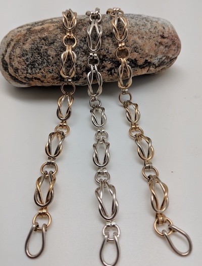 LINDA PAINE Woven Bracelets $295+ Woven Silver Bracelet – Thin Basketweave $250+ Woven Basketweave Bracelet – Thin w/Gold $250+ Woven Bracelet- Rose and Yellow Gold $365 Bracelet – Byzantine Rose, $245 Bracelet – Anchor Chain – $145, Necklace $280 Earrings – Graduated Byzantine $115+ Bracelets – Spring Dare $245+ Necklace – Byzantine Rose, 24″ $495 Necklace – Graduated Byzantine, $395+ based on length Necklace – Anchor, 48″ $325 Bracelets – Celtic Knot SOLD