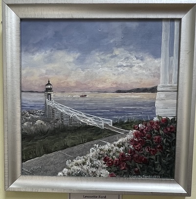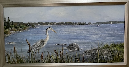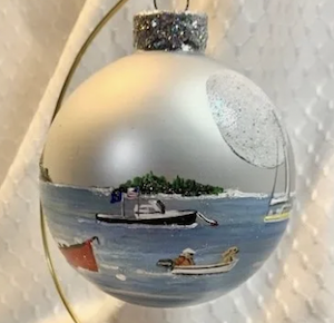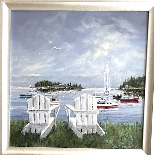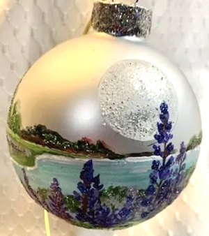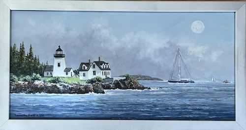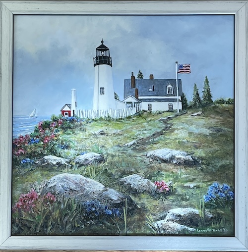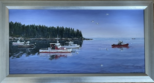 “All Tucked Inn” Giclee, 11×11 $375 “Indian Island Lighthouse” Giclee, 17×9 $395 Spruce Head Island, Oil, 22×12 $595 “Tenants Harbor Rythms” 16×16 Oil, $595 “An Evening at Drift Inn Beach” 28×11 Oil, $595 “Great Blue Heron Martinsville” Oil, 26×14, $700 “Lupine at Smugglers Cove” Oil, 14×14, $475 “Killdeer” Oil, 22×11, $350 “Buoys” Handpainted Sm. Glass Ornament $35 “Cardinals” Handpainted Lg Glass Ornament $50 “Chickadees” Handpainted Lg Glass Ornament $50 “Hummingbird” Handpainted Lg Glass Ornament $50 “Pemaquid Lighthouse” Handpainted Lg Glass Ornament 50 “Maine Guide Dog” Handpainted Sm. Glass Ornament $35 “Summer Comes to Marshall Point” SOLD “Loons in the Mist” SOLD “Pemaquid Lighthouse” SOLD “Winterberry & Chickadees” SOLD “Maine Birds” SOLD “Lupine” SOLD “Rockland Lighthouse” SOLD “Schooner Adventure” HandpaintedGlass Ornament SOLD “Maine Lobster Boat” SOLD